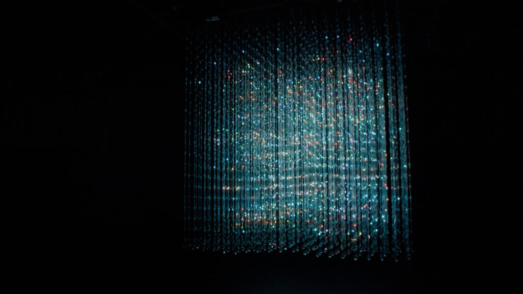 CūBE est une installation immersive qui se présente comme une sculpture de lumière et de son. Suspendu dans l’espace, ce cube de 4 mètres de côté est composé de LED individuellement contrôlables qui réagissent en temps réel à une création sonore originale de Yann Rayon.