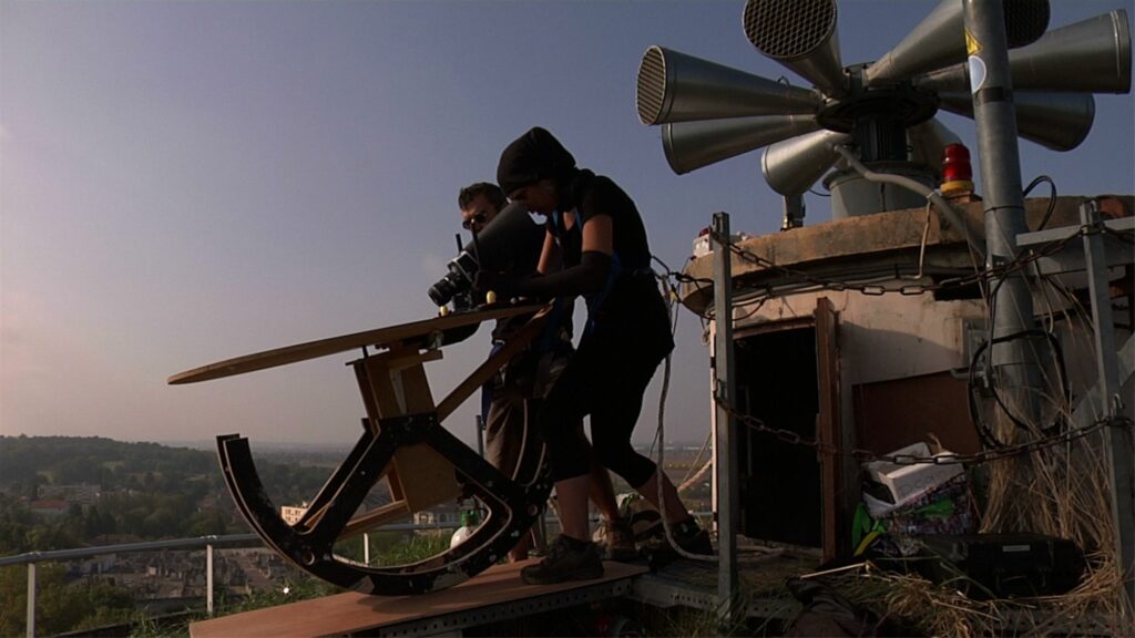 The perspective is from the water drop’s blind spot. The drop’s endless slide is achieved through a tool that keeps it stationary, with the surface moving in the opposite direction of its descent. The filming technique (chase sequence) is reminiscent of wild animal documentary methods. The film was shot on the roof of the Décines-Charpieu water tower. The soundtrack is the unaltered direct environment of the filming (wind, church bells, barking dog, etc.).