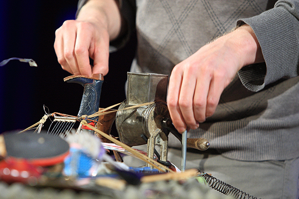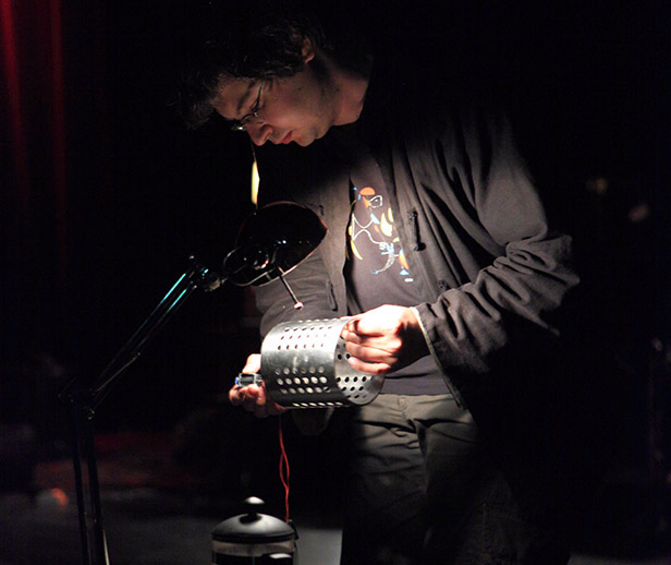 Durant chaque prise, il essaie de contrôler une réaction en chaîne d’événements préalablement appris. Il est assez proche de l’activité d’un bruiteur/expérimentateur s’essayant à reproduire de petites parades sonores et visuelles. Aussi, parce que l’élaboration des dispositifs est basée sur une technologie précaire, la maîtrise du jeu reste improbable. En cela, ses productions sonores et visuelles sont largement ouvertes au hasard et à l‘accident, donnant lieu à des temps d’improvisation et de recherche…