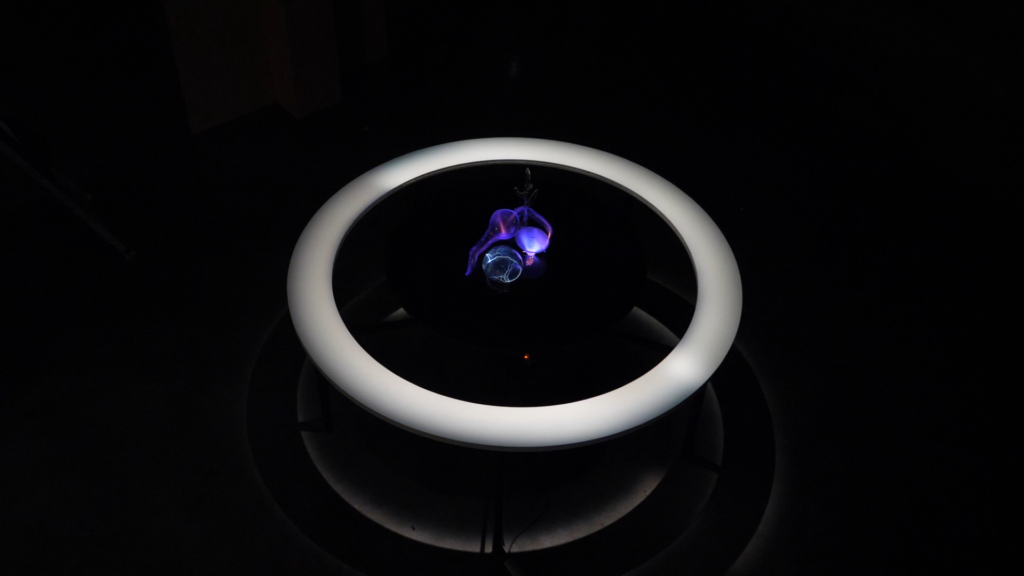 Chacune des formes en verre contiennent différents gaz qui composent le milieu interstellaire : argon, néon, krypton, xénon, nitrogène… Elles sont tissées de la même étoffe que le soleil : le plasma (quatrième état de la matière, le plasma compose 99 % de notre univers visible).