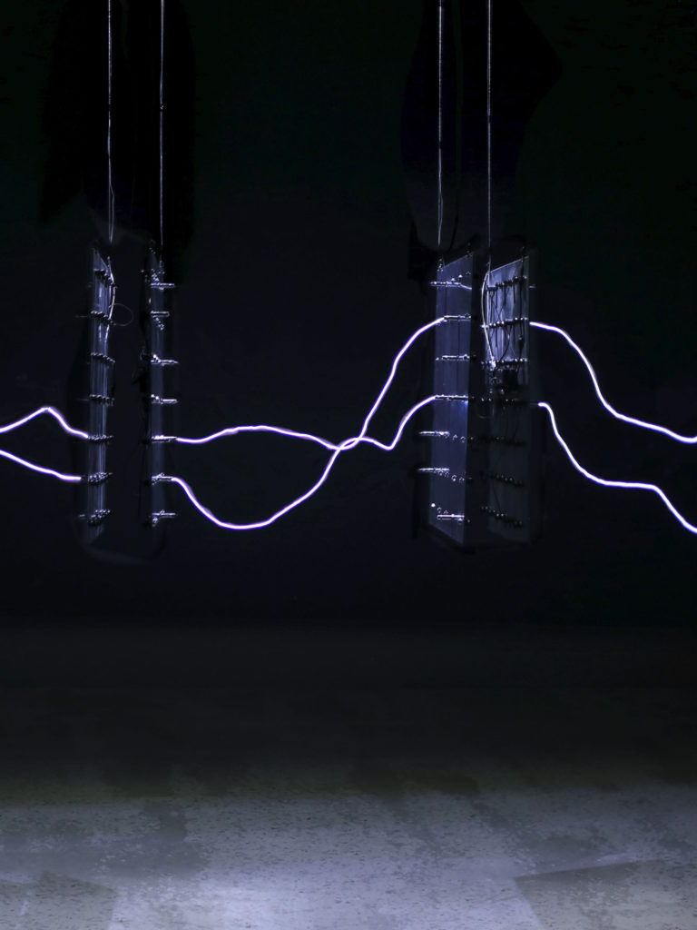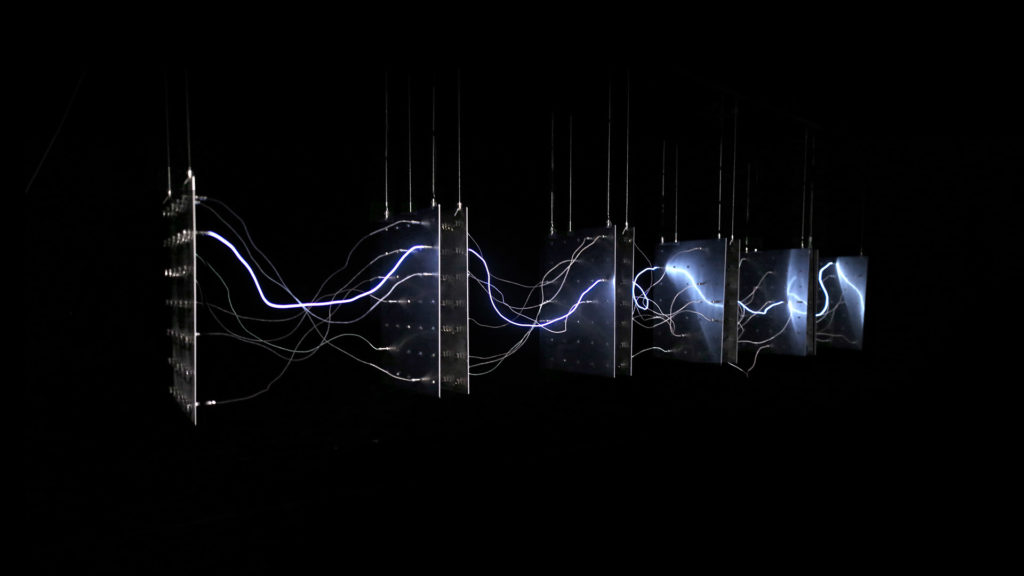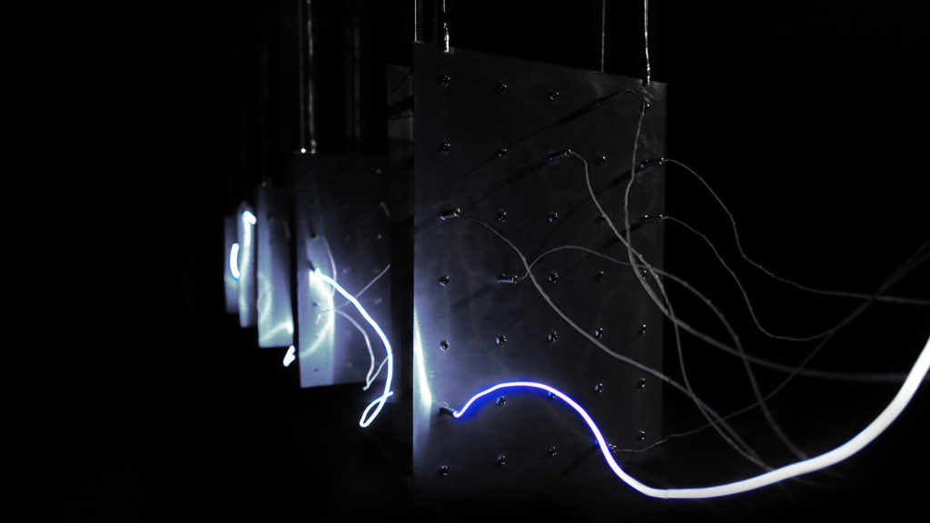 Cependant, l’impulsion lumineuse ne réapparaît pas nécessairement là où on l’attend, accentuant le caractère discontinu de l’œuvre et, par extension, nous rappelle l’aspect indéterminé – voire hasardeux ‘ du flot de la pensée. Les séquences lumineuses ne se propagent donc pas de manière fluide et régulière : elles se comportent plutôt comme des décharges discontinues et disruptives.