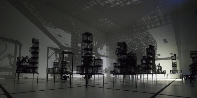 Taotie uses a mobile robotic platform to cast light upon a landscape of sculptures that evoke contemporary storage and logistics spaces.