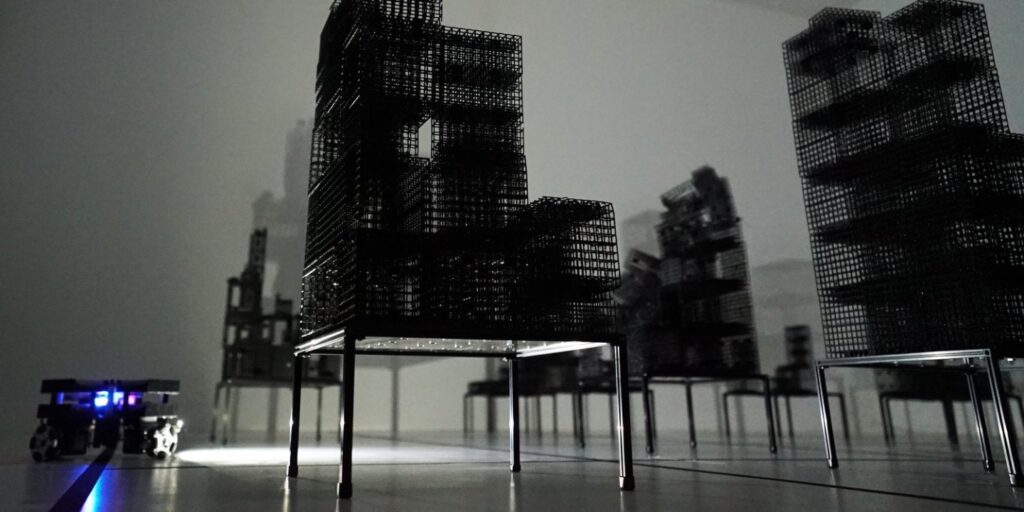 Taotie fait usage d’une plateforme robotique mouvante, mettant en lumière un paysage de sculptures évoquant des espaces de stockage et logistique contemporains.