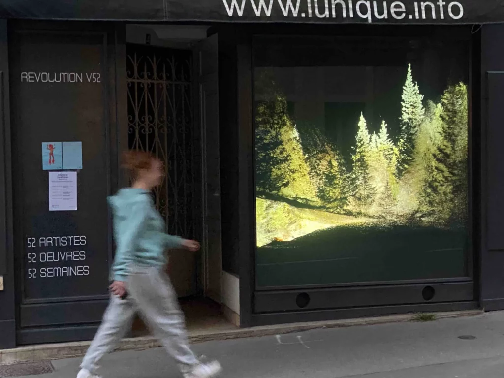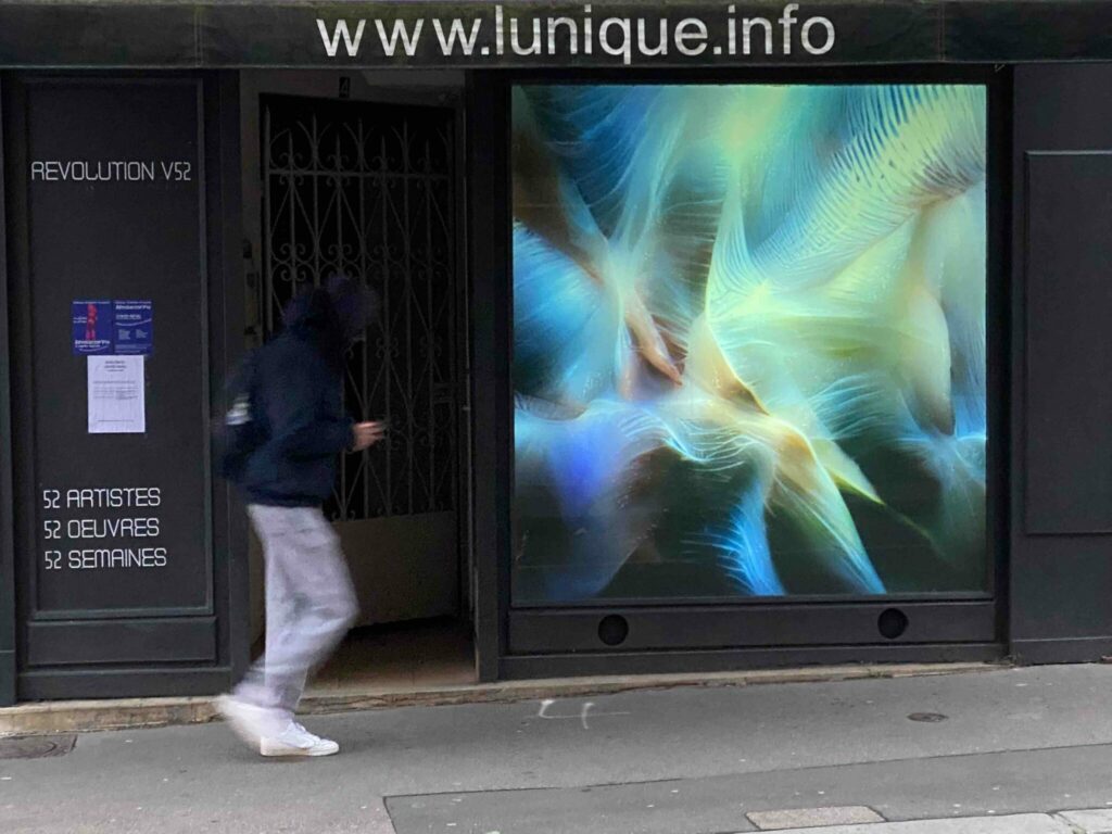 Révolution V52 is an excursion into the global panorama of digital visual creation. Thanks to a screen display, visitors can discover the work of an artist, which changes every week. A total of 52 works are presented, like a tour of the globe in 52 weeks and 52 destinations. Révolution 52 is also an exploration of the dissemination of dematerialized works, their accessibility to the widest possible audience, and the re-enchantment of space. The exhibition can be seen simultaneously in Caen and Marseille.
